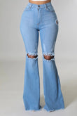 Full Length 5 pocket flare jean features ripped detail frayed hem, Medium Blue wash, 32\" Inseam, made in Los Angeles