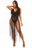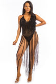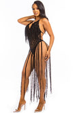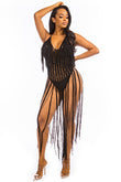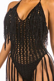 Sexy one piece crochet, v-neckline with neck strip, front multi fringed hemline (no underwear)
